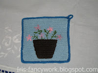 Двухслойные прихватки связаны крючком №1,25 акриловой пряжей 125м/30г столбиками без накида, лицевая часть украшена связанным отдельно элементом "кашпо" и вышитыми цветами.