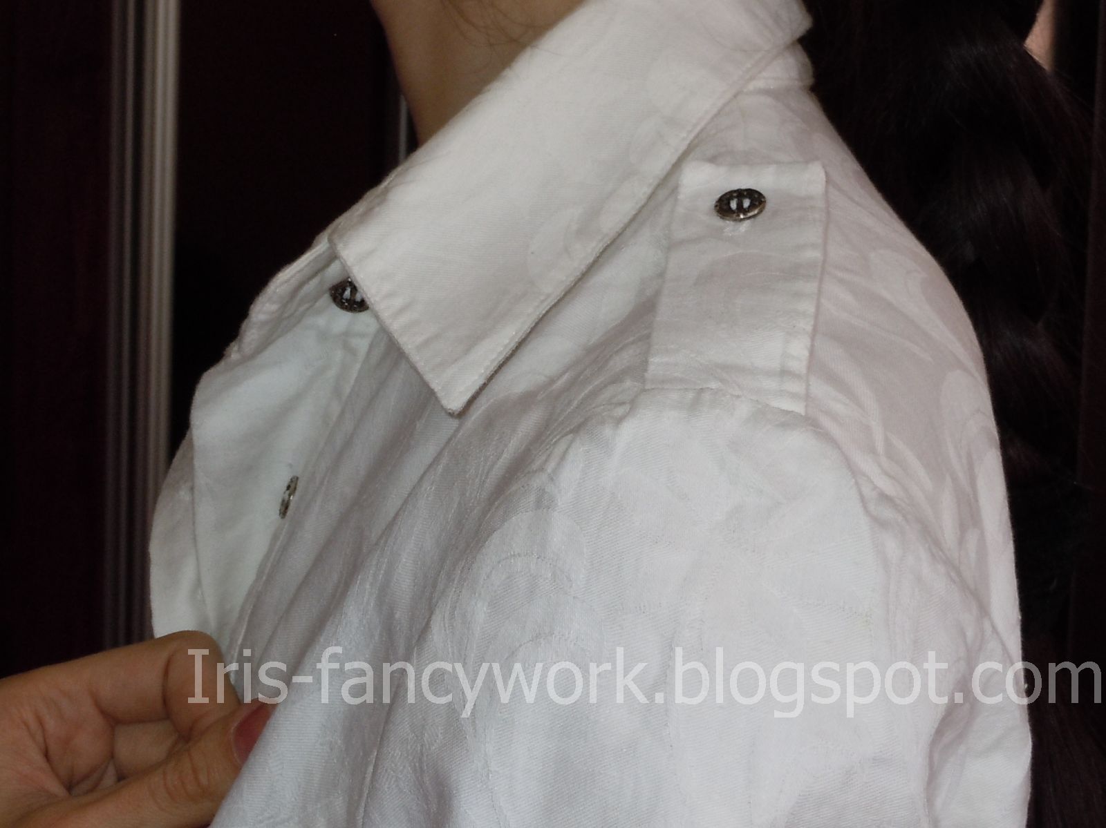 Блузка приталенного силуэта сшита из плотного жаккардового сатина белого цвета. Широкая планка украшена двумя рядами пуговиц. Строгий характер блузке придают погоны и воротник сорочечного типа со стойкой.