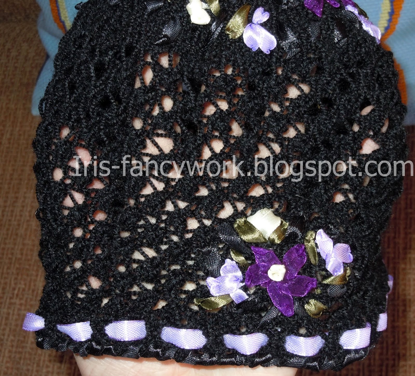 Шапочка связана спицами №1 пряжей Kartopu 400м/100г черного цвета легким ажурным узором "шиповник". Верх шапочки полностью расшит лентами шириной 0,7 см - для цветов использованы сиреневые, фиолетовые ленты и ленты цвета экрю, для листьев - черные и цвета скошенной травы. Край шапочки обвит лентой и отделан швом "вперед иголку".